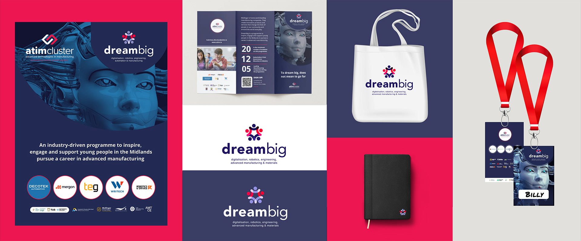 This project involved the development of a dynamic brand identity for DreamBig, an industry-led initiative encouraging students aged 15+ to pursue careers in advanced manufacturing across the Irish Midlands. Designed to feel both inspiring and credible, the identity communicates innovation while remaining aligned with the established ATIM Cluster brand framework.