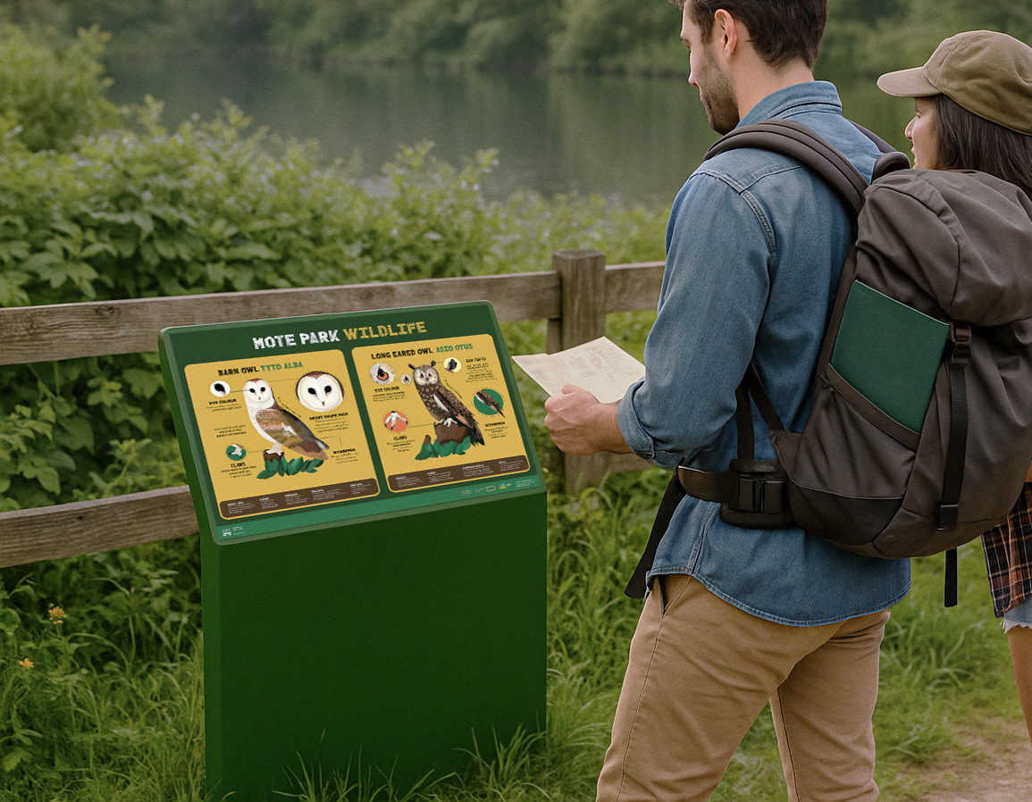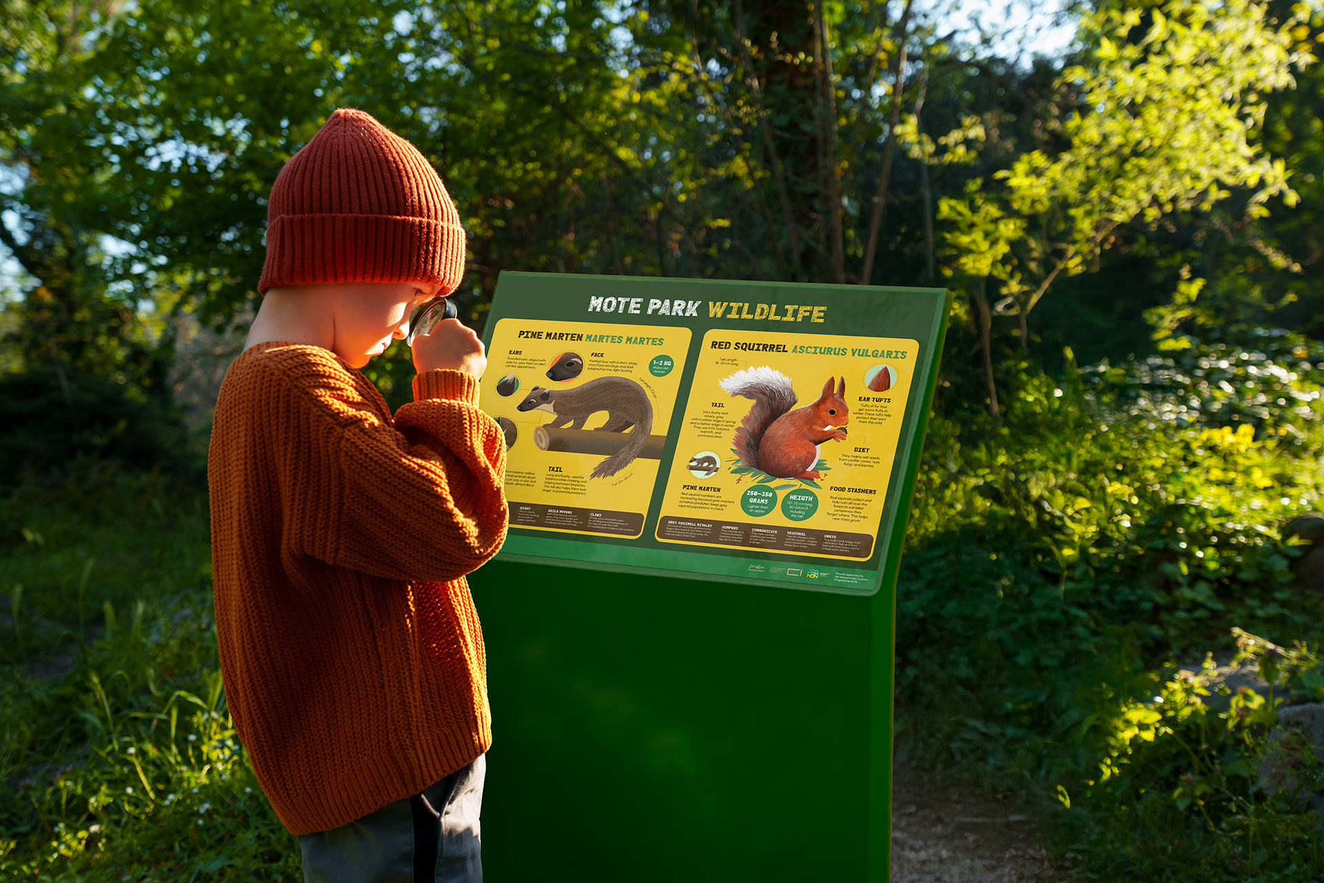 This project involved the design and illustration of a series of wildlife information signs for Mote Park, combining bespoke illustration, clear information design, and durable outdoor signage. I created a custom illustration style focused on animal illustration and educational infographics, paired with accessible typography and strong visual hierarchy to ensure clarity for visitors of all ages. The signage system was designed to work naturally within the park environment while remaining legible and engaging, and to scale into wayfinding design, map graphics, trail signage, educational materials, and environmental graphics in future phases. The result is a flexible visual system that enhances visitor experience, supports learning, and provides a strong foundation for long-term signage and mapping across the park.